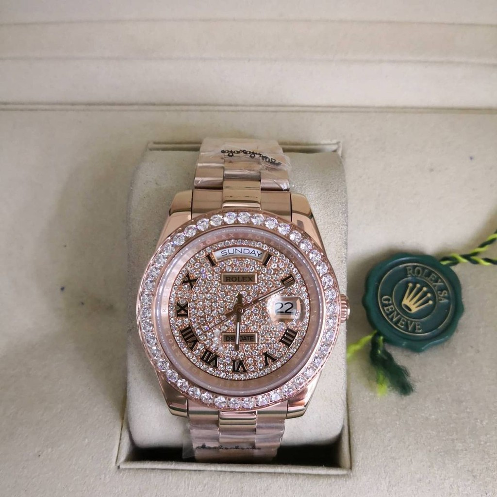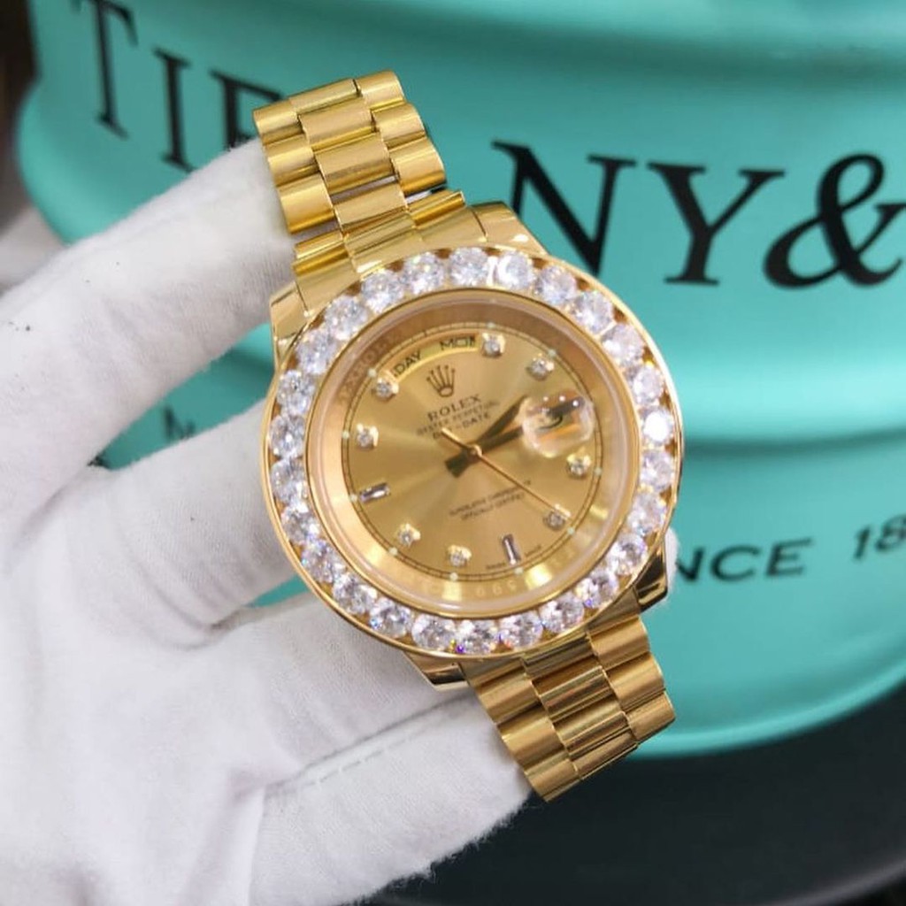 Relógio rolex day date dourado com fundo verde oliva, numeração romana, caixa 41mm, com datador, banho ouro 18k, pulseira president, com todos os funcionais, automático ( movimento a ….. 285 reais con 12 centavos r$ 285. Um rolex datejust em aço com 41 mm de diâmetro custa cerca de 5.900 euros, como novo.